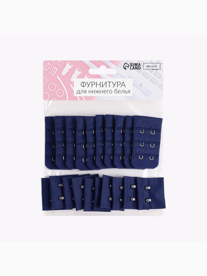 Надёжное решение для ремонта и пошива – тёмно-синие застёжки для бюстгальтеров из прочного полиэстера. В наборе 10 готовых к использованию элементов с тремя рядами крючков – подходят для большинства моделей.