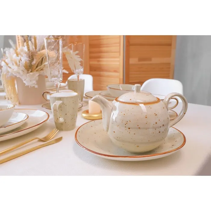 Фарфор этой коллекции отличается неповторимым цветом: нежный бежевый в крапинку. Такое цветовое решение делает каждую тарелку, кружку, блюдце или салатник настоящим произведением искусства.