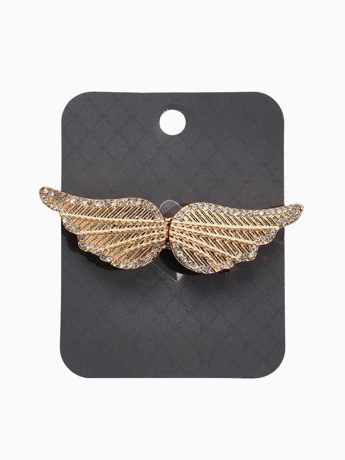 Украсьте свой образ романтическими мотивами с помощью изящного зажима в виде белоснежных крыльев, покрытых золотыми акцентами. Длина изделия — всего 6 см, а инкрустированные стразы образуют красивые светлые точки, символизирующие полет фантазии и свободы. Красочный аксессуар, сделанный в популярном стиле «ангельских крыльев», добавит вашему облику оригинальности и романтики.