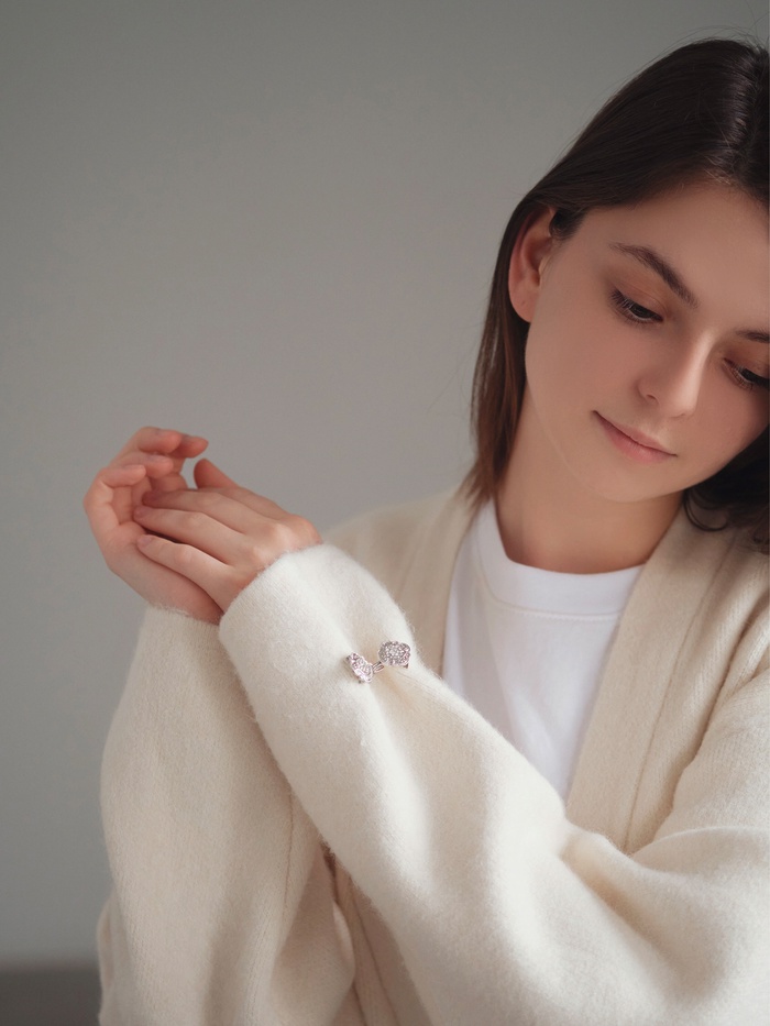 - Цвет фурнитуры — серебряный, гармонирует с белым основанием и подходит к различным стилям одежды.