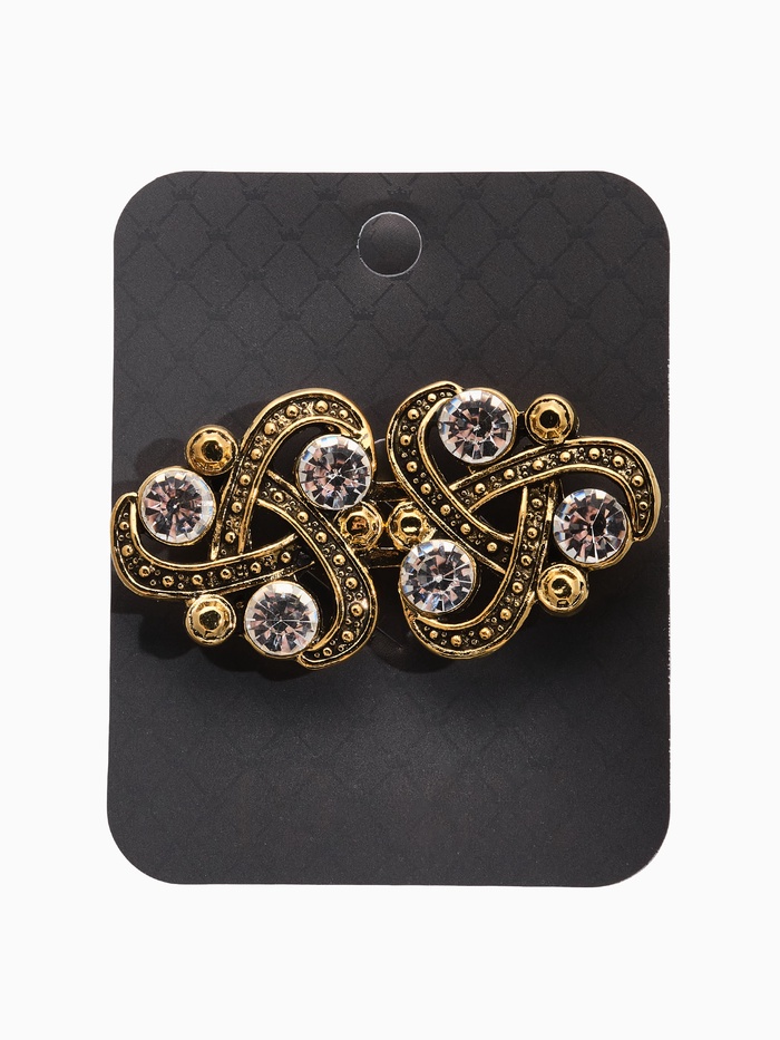 Изящный белый узел на поверхности тёмного золота приглашает добавить немного роскоши в ваш гардероб. Аккуратный зажим длиной 5,5 см украшен миниатюрными стразами, словно россыпью звёзд, переливающихся при каждом движении. Такой аксессуар прекрасно сочетается с одеждой разных стилей, делая образ одновременно элегантным и современным.