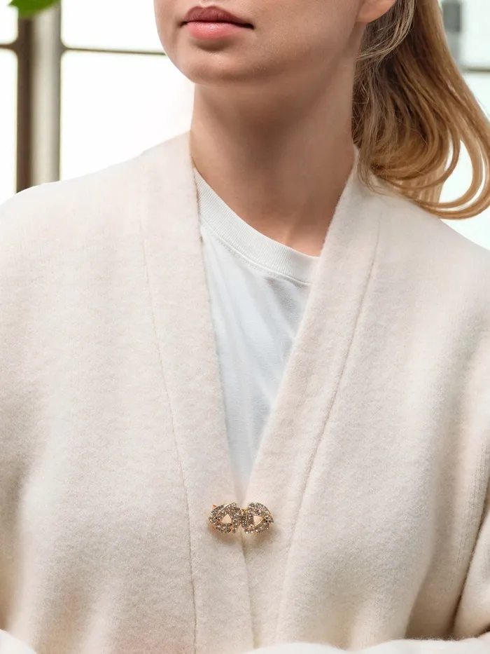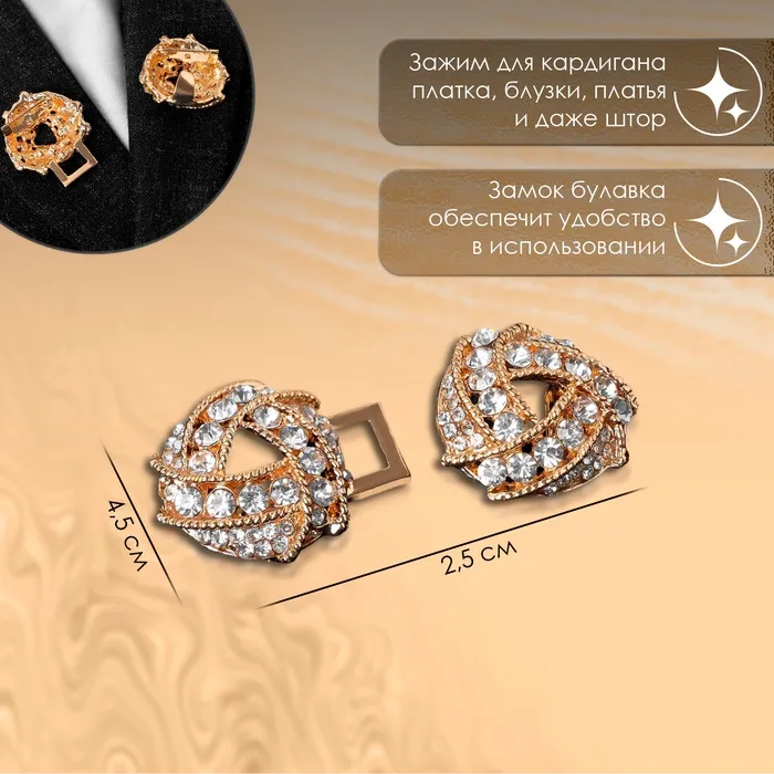 Зажим для кардигана - изысканный аксессуар, в том числе на поверхности платья, шали или свитера, данный элемент можно использовать даже для штор. Зажимы актуальны как в повседневном так и праздничном образе, добавляют очарования вашей одежде при сочетании различных нарядов.
