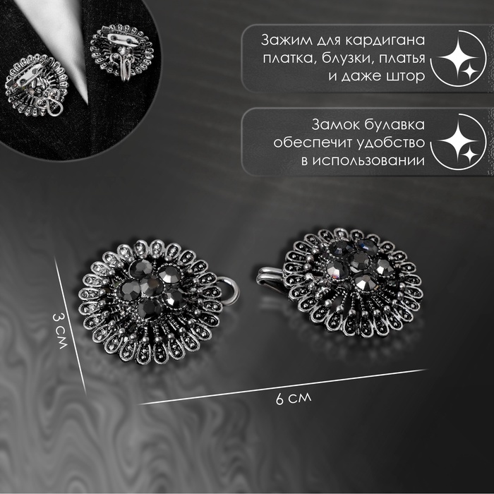 Зажим для кардигана «Конус цветок», цвет серый в чернёном серебре — Характеристики