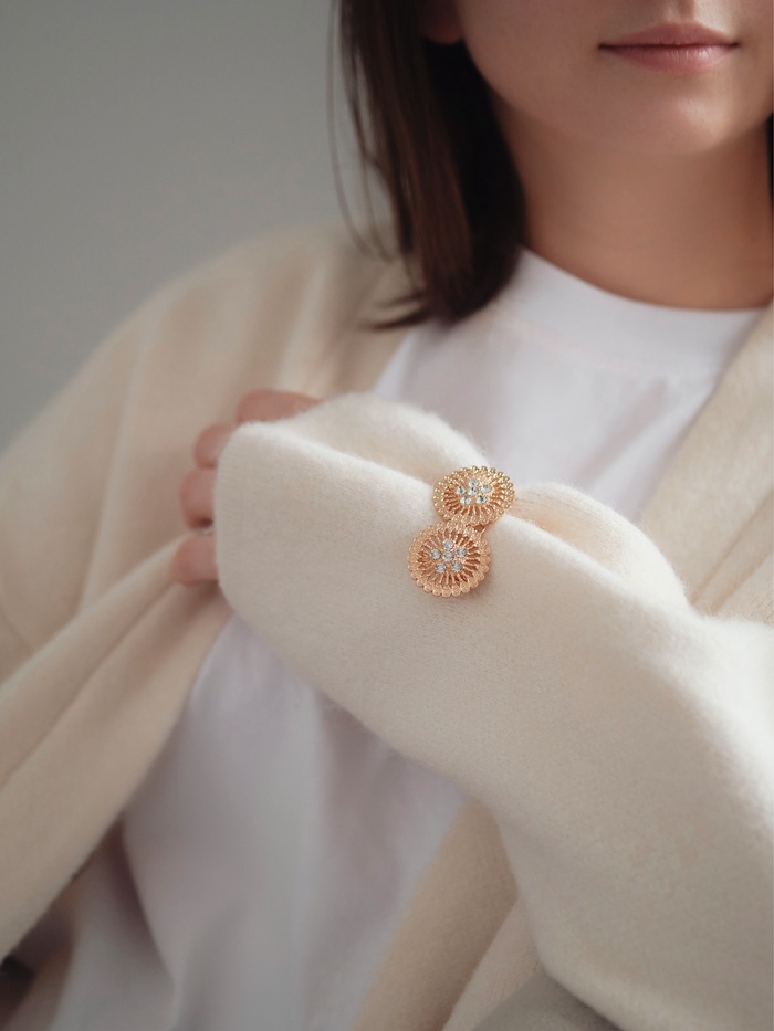 - Цвет фурнитуры — золотой, гармонирует с белым основанием и подходит к различным стилям одежды.