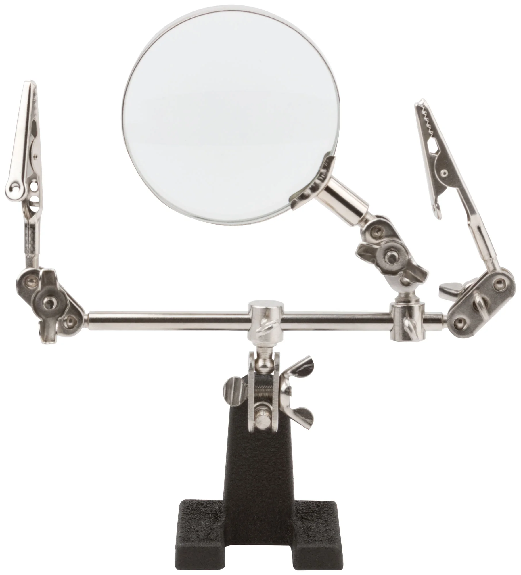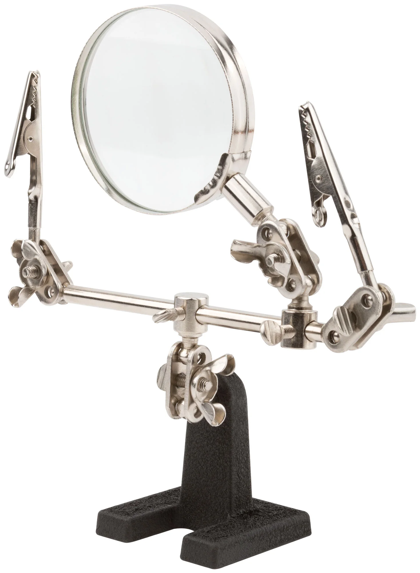 Зажим оснащен устойчивой литой станиной и зажимами, которые надежно фиксируют деталь во время работы. Лупа диаметром 62 мм с трехкратным увеличением помогает четко видеть даже самые мелкие элементы, что значительно облегчает процесс пайки.