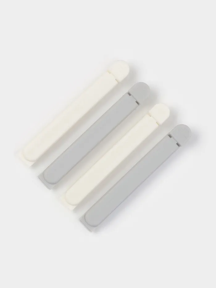 В наборе вы получите 4 зажима, выполненных в элегантных белом и сером цветах, которые легко впишутся в любой интерьер. Изготовленные из прочного пластика, они обеспечивают надежное закрытие пакетов, предотвращая попадание воздуха и влаги.