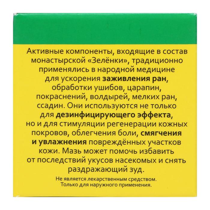 Активные компоненты, входящие в состав монастырской «Зеленки», оказывают антисептическое воздействие, не причиняя при этом вреда тканям. Мазь действует очень мягко, не грозит пересушиванием или ожогами кожи и не всасывается в чрезмерных количествах.