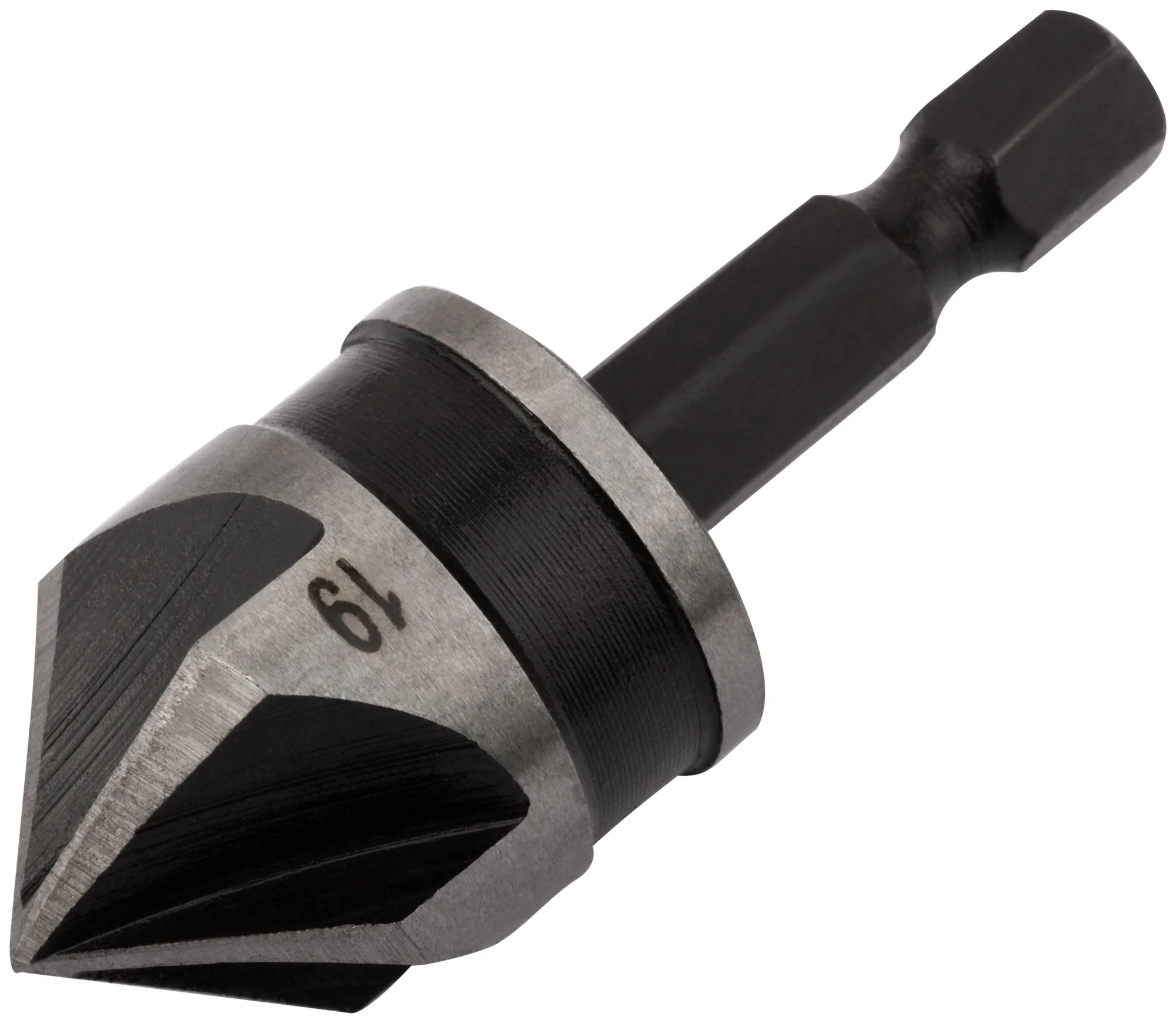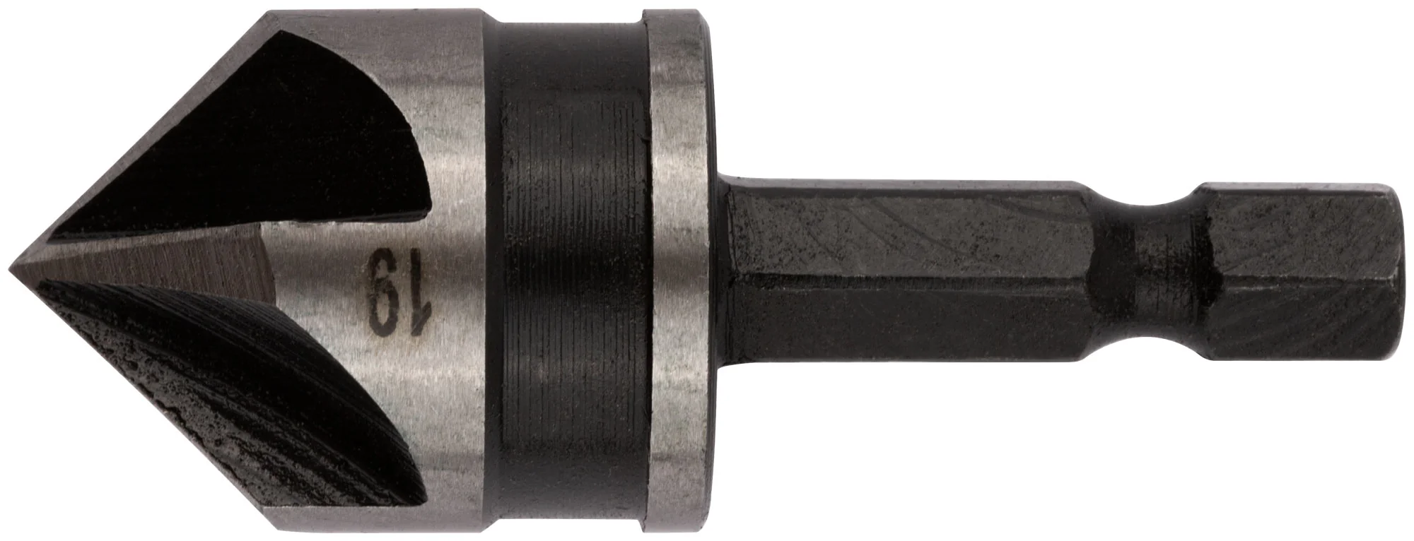 Зенкер изготовлен из прочной легированной стали и оснащён хвостовиком под биту, что обеспечивает надёжное крепление и лёгкую замену инструмента. Он подходит для использования с дрелями на высокой скорости, что ускоряет процесс обработки.