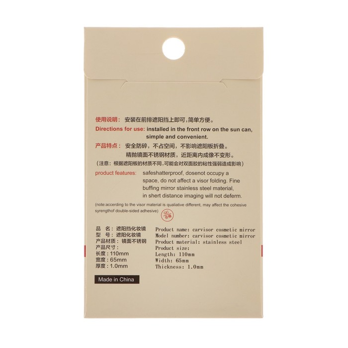 Данное зеркало предназначено для крепления на солнцезащитный козырек или на любом удобном для вас месте. Зеркало надежно фиксируется на двухсторонний скотч. Ультратонкая конструкция при установке на козырек не будет визуально заметна. Зеркало изготовлено из зеркальной нержавеющей стали и зеркального стекла высокой четкости (не искажает), идеальный внешний вид и устойчивость к царапинам. Задняя часть декоративного зеркала клейкая, нужно просто сорвать защитную пленку и установить его.