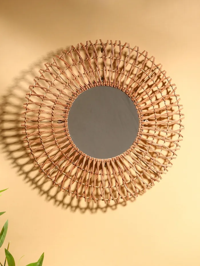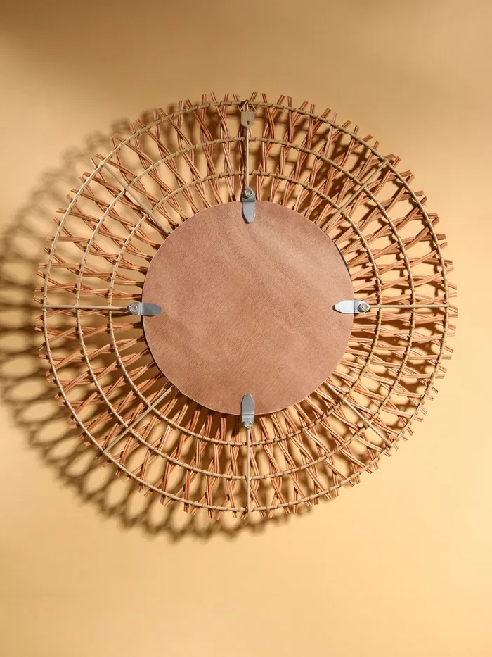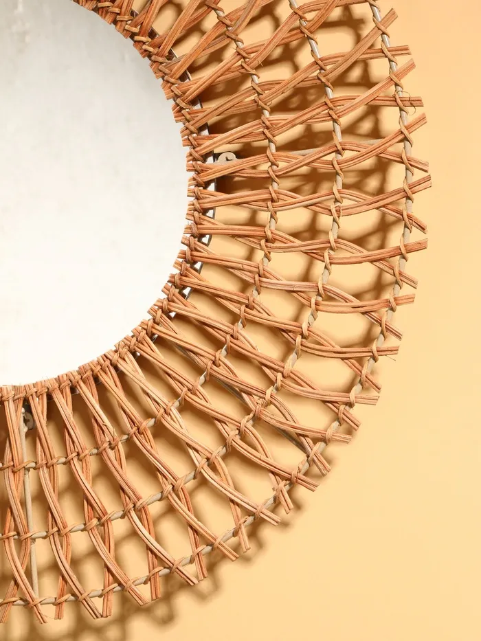 Круглое зеркало с рамой из ротанга станет стильным и функциональным акцентом в вашем интерьере. Его компактный размер и натуральные материалы делают его универсальным выбором для любого помещения.