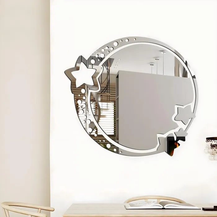 Данный вариант настенного зеркала в виде панно – это волшебный аксессуар, который превратит ваш интерьер в сказочное пространство. Выполнено из качественного акрила толщиной 1 мм, оно отличается лёгкостью и долговечностью. Размер панели составляет 22 x 19 см, что делает её заметной деталью любого помещения. Центральным элементом композиции является крупный круглый фрагмент, внутри которого изображён полумесяц. По периметру круга расположены яркие звёзды разных размеров, создающие ощущение ночного неба. Такой дизайн идеально подойдёт для детской комнаты, спальни или гостиной, придавая им атмосферу загадочности и романтики.