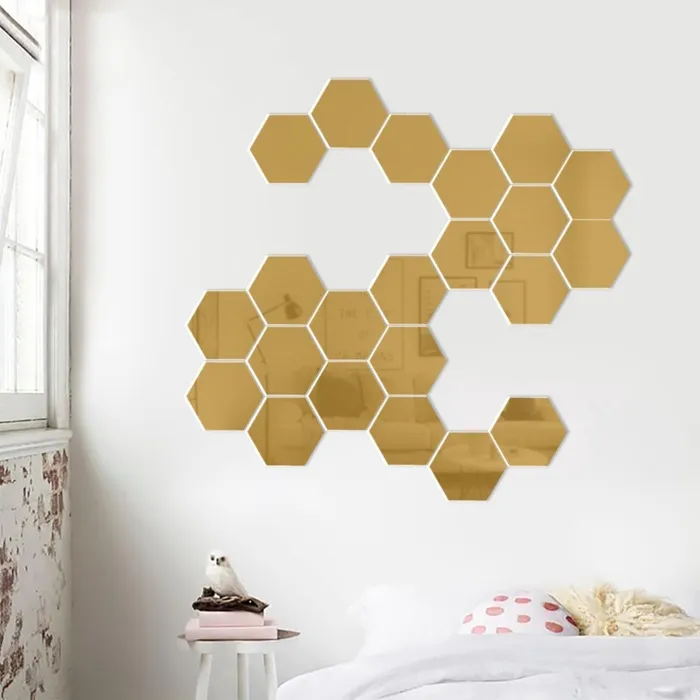 Зеркальные панели золотые шестиугольники — это стильное решение для акцента в интерьере. Они не только визуально расширяют пространство, но и вносят нотку элегантности благодаря своему тёплому золотистому оттенку. Создайте уникальные геометрические узоры на вашей стене с помощью этой акриловой поверхности, её материал обеспечивает лёгкость ухода и долговечность.