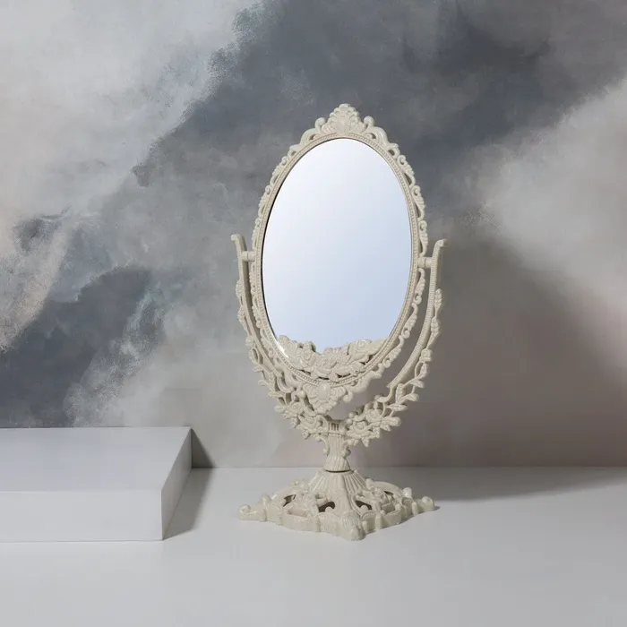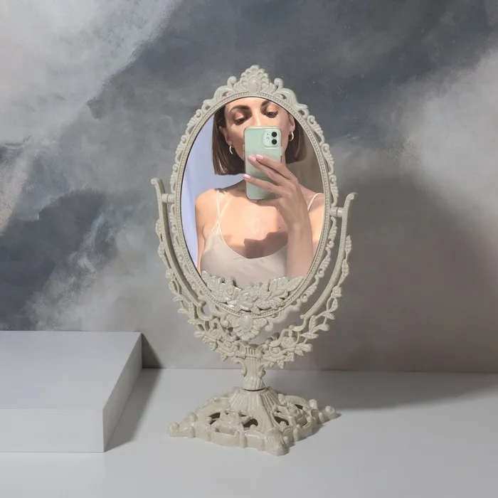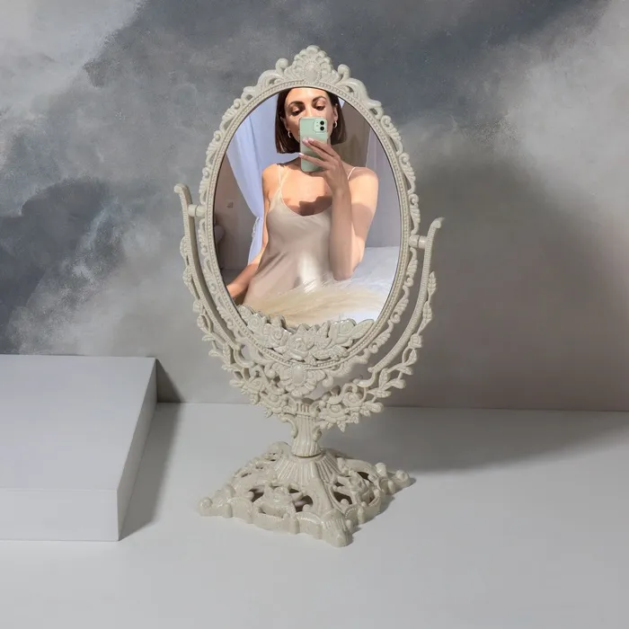 Изящное зеркало на ножке — украшение для туалетного столика. Конструкция не расшатывается и устойчиво держится на поверхности. Увеличивающая линза пригодится, чтобы рассмотреть детали макияжа.