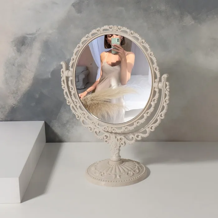 Изящное зеркало на ножке — украшение для туалетного столика. Конструкция не расшатывается и устойчиво держится на поверхности. Увеличивающая линза пригодится, чтобы рассмотреть детали макияжа.