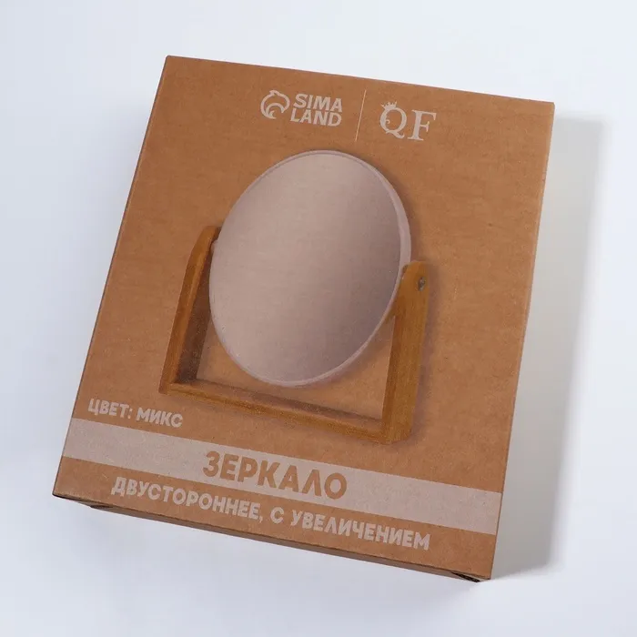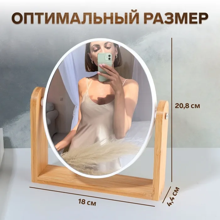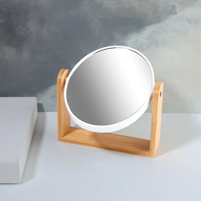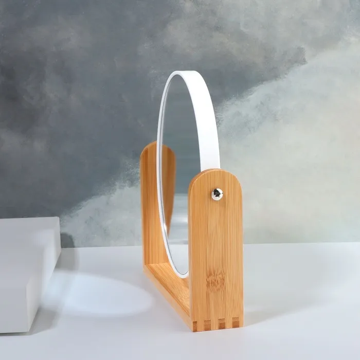 Изящное зеркало на подставке — украшение для туалетного столика. Конструкция не расшатывается и устойчиво держится на поверхности. Аксессуар с подставкой из бамбукового дерева гармонично впишется в интерьер и станет его стильным дополнением.