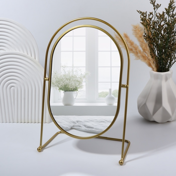 Классическая форма зеркала акцентирована изящной рамкой нежного золотистого оттенка, которая прекрасно отражает свет и создает эффект роскоши. Эта золотая отделка придаёт зеркалу особый шарм и утонченность, что делает его идеальным дополнением как для романтического, так и для современного интерьера.