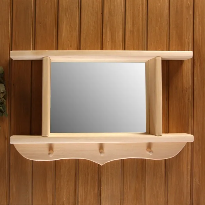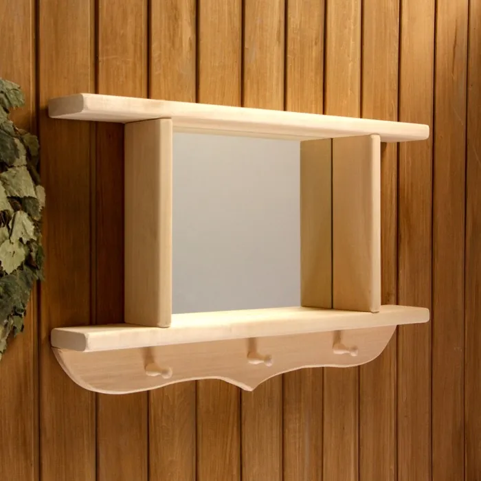 Такое зеркало подойдёт для бани и сауны. Дерево не выделяет вредных веществ при нагревании и подходит для помещений с высокой влажностью.