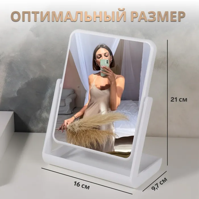 Изящное зеркало на подставке — украшение для туалетного столика. Конструкция не расшатывается и устойчиво держится на поверхности. Аксессуар с минималистичным дизайном впишется в интерьер и станет его гармоничным дополнением.