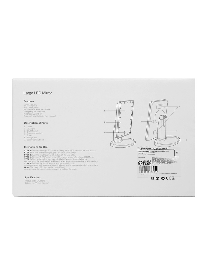 Зеркало с подсветкой KZ-06, 26.5×16×12 см, 22 диода, сенсорная кнопка, белое — Характеристики
