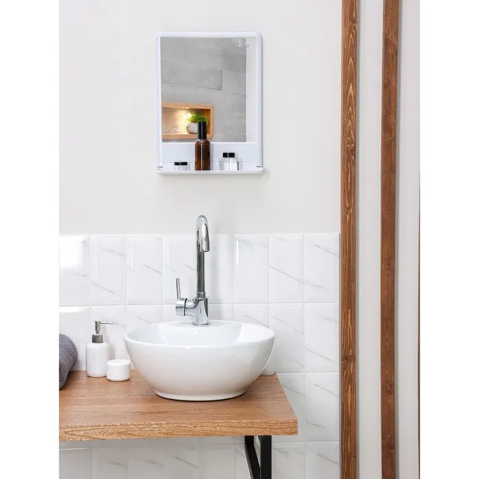 Высокие бортики предохраняют ваши косметические средства от падения, а аккуратная перфорация избавит от скопления воды. При необходимости полку можно сложить. Белорусский пластик будет радовать вас качеством и длительным сроком службы, а входящие в состав дюбеля и шурупы помогут надежно закрепить набор на стене. Улыбнитесь вашему отражению!