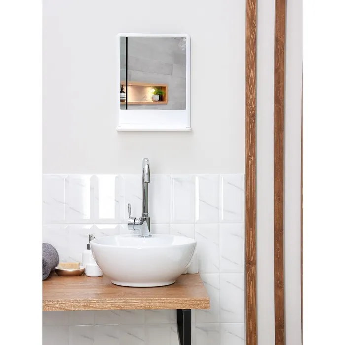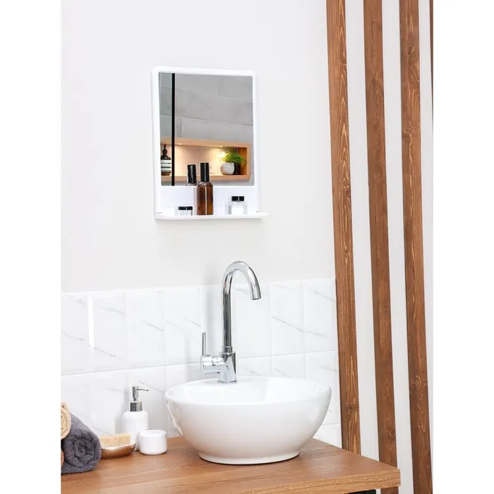 Высокие бортики предохраняют ваши косметические средства от падения, а аккуратная перфорация избавит от скопления воды. При необходимости полку можно сложить. Белорусский пластик будет радовать вас качеством и длительным сроком службы, а входящие в состав дюбеля и шурупы помогут надежно закрепить набор на стене. Улыбнитесь вашему отражению!