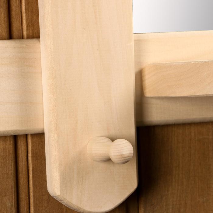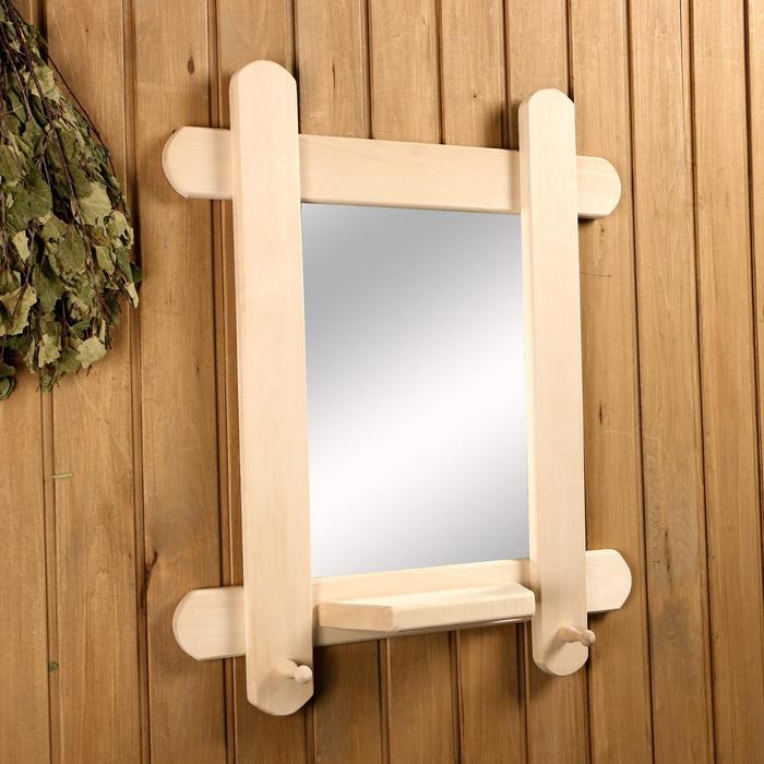 Такое зеркало подойдёт для бани и сауны. Дерево не выделяет вредных веществ при нагревании и подходит для помещений с высокой влажностью.