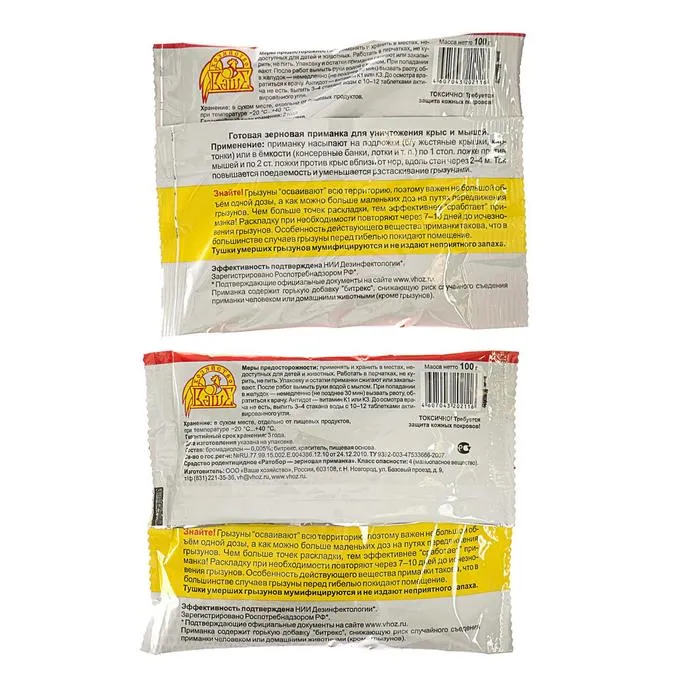 Применение: приманку насыпают на подложки (б/у жестяные крышки, картонки) или в ёмкости (консервные банки, лотки и т. п.) по 1 стол. ложке против мышей и по 2 ст. ложки против крыс вблизи от нор, вдоль стен через 2–4 м. Так повышается поедаемость и уменьшается растаскивание грызунами.