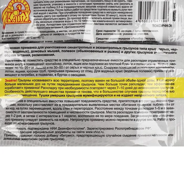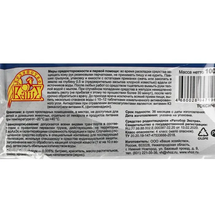 Меры предосторожности и первой помощи: во время раскладки средства защищать кожу рук резиновыми перчатками, не принимать пищу и не курить. Павших грызунов, упаковку и емкости с остатками приманки сжечь или закопать в землю на глубину 0,5 м (предварительно засыпав хлорной известью) вдали от источников воды. После любых работ со средством тщательно вымыть руки теплой водой с мылом. При попадании на кожу - тщательно промыть водой с мылом, в глаза - обильно промыть водой или 2% раствором пищевой соды, после чего закапать 1-2 капли 20-30% раствора сульфацила натрия. При случайном попадании средства в желудок немедленно (не позднее 30 мин) вызвать рвоту. Исключить всякий прием пищи, выпить несколько стаканов воды с 10-12 таблетками измельченного активированного угля. При развитии симптомов интоксикации немедленно обратиться к врачу. Антидоты: витамин К3 (викасол) или витамин К, (фитоменадион).