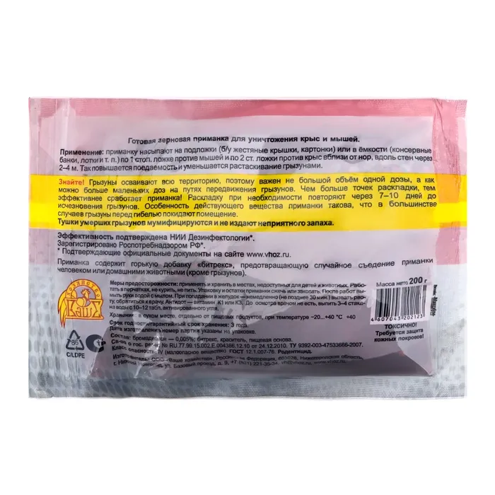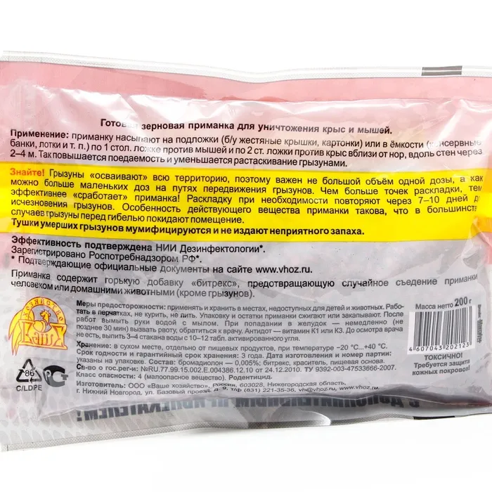 Знайте! Грызуны «осваивают» всю территорию, поэтому важен не большой объём одной дозы, а как можно больше маленьких доз на путях передвижения грызунов. Чем больше точек раскладки, тем эффективнее «сработает» приманка! Раскладку при необходимости повторяют через 7–10 дней до исчезновения грызунов. Тушки умерших грызунов мумифицируются и не издают неприятного запаха.Меры предосторожности: применять и хранить в местах, недоступных для детей и животных. Работать в перчатках, не курить, не пить. Упаковку и остатки приманки сжигают или закапывают. После работ вымыть руки водой с мылом. При попадании в желудок — немедленно (не позднее 30 мин) вызвать рвоту, обратиться к врачу. Антидот — витамин К1 или К3. До осмотра врача не есть, выпить 3–4 стакана воды с 10–12 таблетками активированнго угля.
