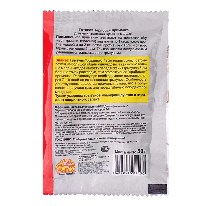 Применение: приманку насыпают на подложки (б/у жестяные крышки, картонки) или в ёмкости (консервные банки, лотки и т. п.) по 1 стол. ложке против мышей и по 2 ст. ложки против крыс вблизи от нор, вдоль стен через 2–4 м. Так повышается поедаемость и уменьшается растаскивание грызунами.
