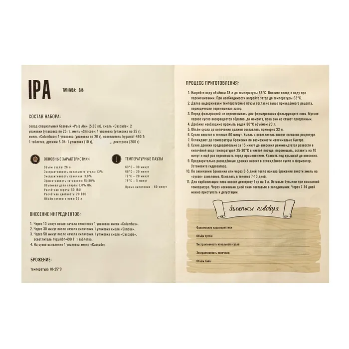 Испытайте свое кулинарное мастерство и насладитесь процессом создания собственного хмельного IPA с зерновым набором "IPA". Этот набор подарит вам не только неповторимый вкус, но и множество увлекательных моментов в мире домашнего пивоварения!