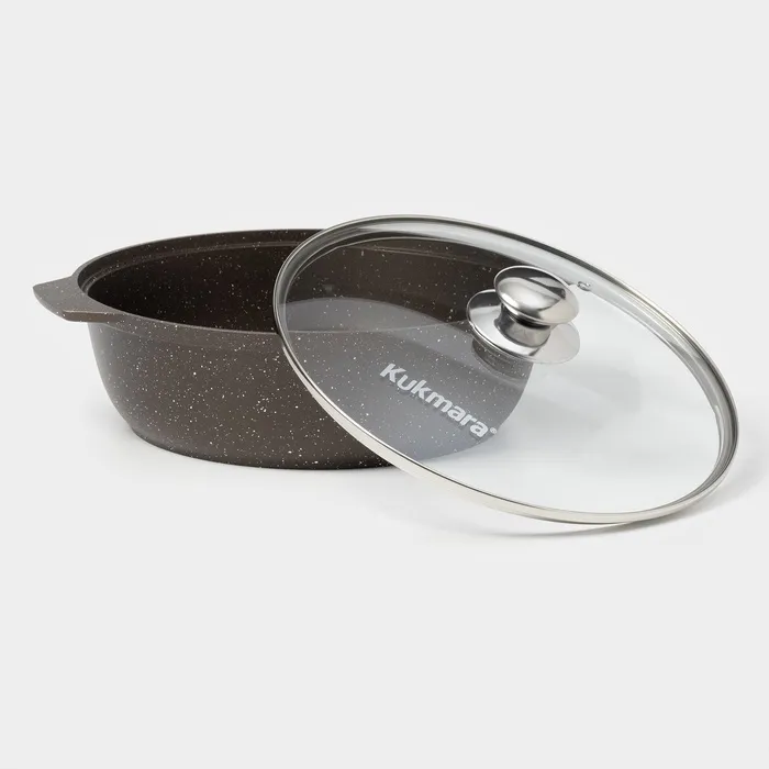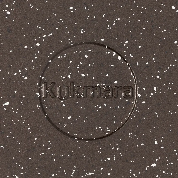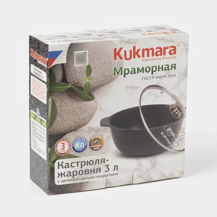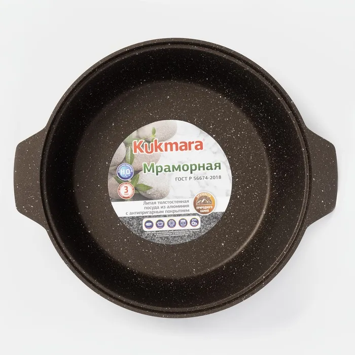 Кастрюля-жаровня Kukmara сделана из литого алюминия. Имеет инновационное антипригарное мраморное покрытие на водной основе, которое изготовлено по немецкой технологии (Weilburger Coatings GmbH) и усилено сверхтвёрдыми частицами минералов.