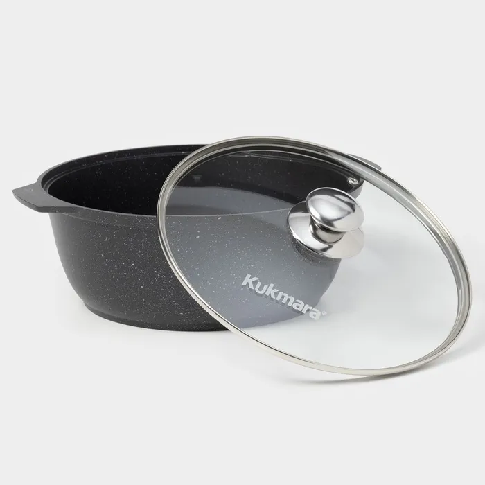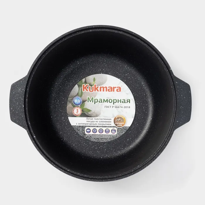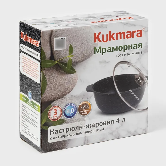 Кастрюля-жаровня Kukmara сделана из литого алюминия. Имеет инновационное антипригарное мраморное покрытие на водной основе, которое изготовлено по немецкой технологии (Weilburger Coatings GmbH) и усилено сверхтвёрдыми частицами минералов.