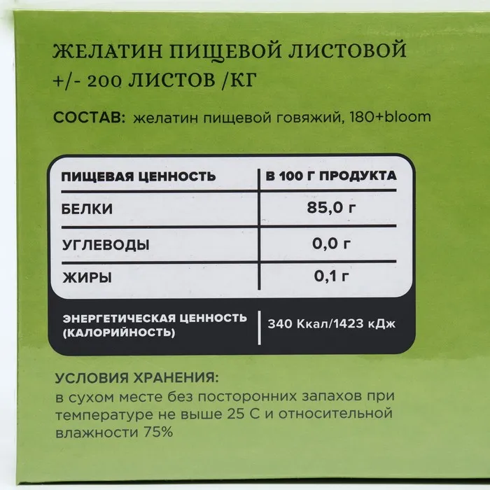 - Листовой желатин Valde имеет постоянную массу листа – 5 г. Это позволяет не пользоваться весами при приготовлении блюд. Возможность точного дозирования листового желатина Valde – важное преимущество перед порошковым желатином.