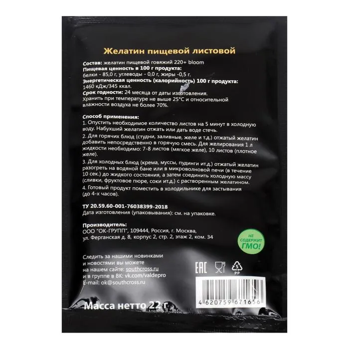 - Листовой желатин Valde имеет постоянную массу листа – 5 г. Это позволяет не пользоваться весами при приготовлении блюд. Возможность точного дозирования листового желатина Valde – важное преимущество перед порошковым желатином.