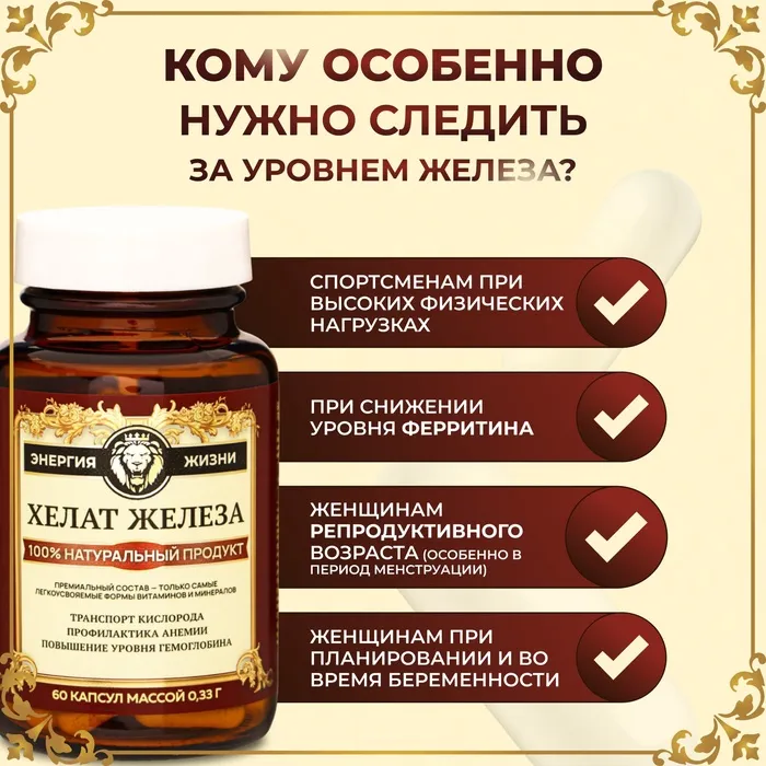 в качестве биологически активной добавки к пище - дополнительного источника железа. Биодоступное легкоусвояемое железо из аминокислотного хелатного комплекса, способствует поддержанию в норме уровня ферритина и гемоглобина, снижению риска развития анемии, снижению усталости, повышению работоспособности, хорошей переносимости без побочных эффектов со стороны желудочно-кишечного тракта.