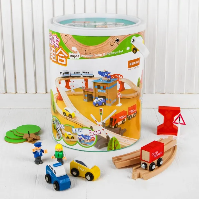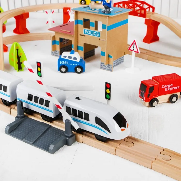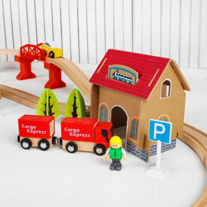 Деревянная железная дорога с вертолётной площадкой — это увлекательный набор из 88 элементов для создания многоуровневых маршрутов. В комплекте современный поезд с тремя вагонами, легковая машинка, грузовик, мост и переезд. Набор подходит для детей от 3 лет и работает от одной батарейки типа AA.