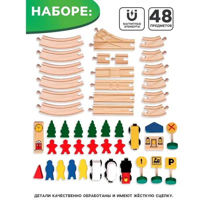 Игрушка изготовлена из натурального дерева, поэтому она прочная и долговечная. Детали железной дороги легко соединяются между собой, что позволяет ребёнку самостоятельно собирать и разбирать её.