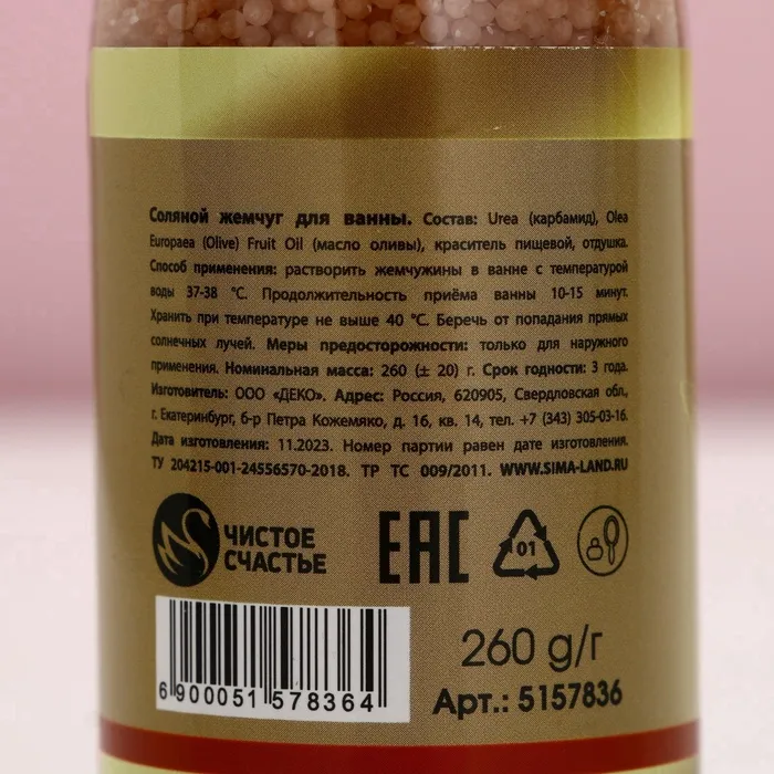 Жемчуг для ванны, 260 г, аромат ванили и молока, Чистое счастье — Характеристики