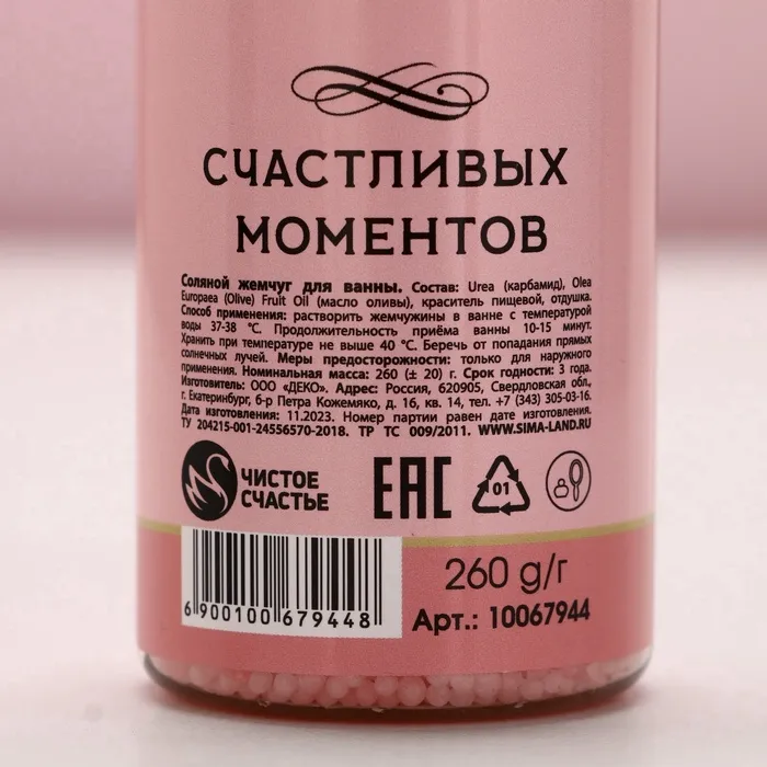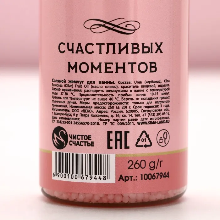 Жемчуг для ванны «Мечтай!», 260 г, аромат ягодного суфле, Чистое счастье — Характеристики