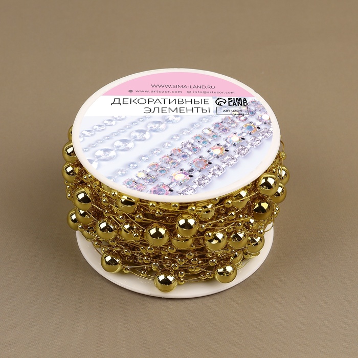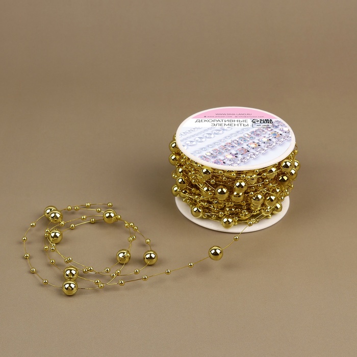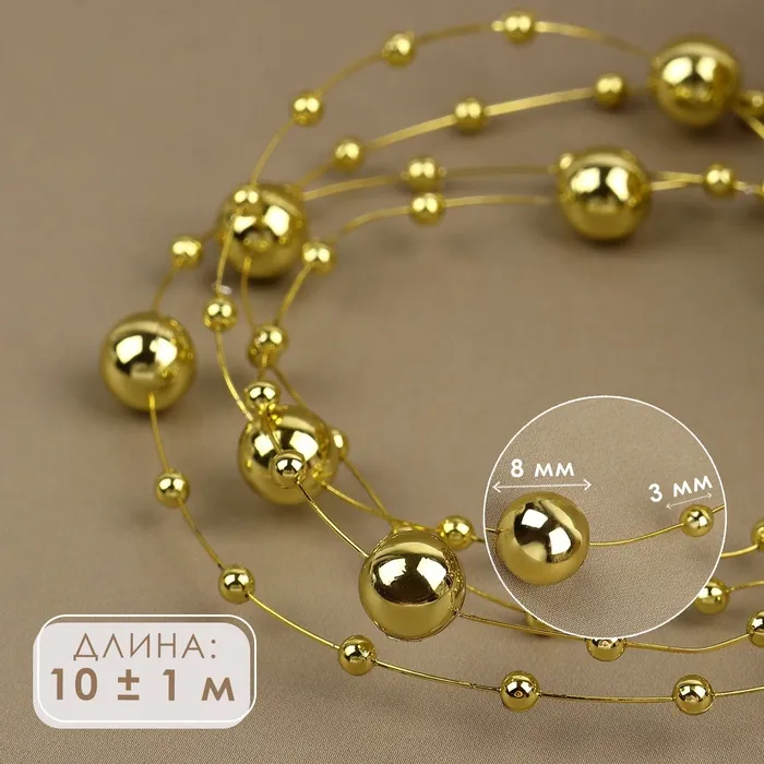 Изысканная нить золотистого жемчуга разного калибра (3 и 8 мм) станет элегантным дополнением ваших творческих проектов. 10 метров пластиковых бусин на прочной леске позволяют создавать украшения, декорировать одежду или оформлять интерьер. Чередование мелких и крупных элементов создает эффект роскошного дизайнерского аксессуара.