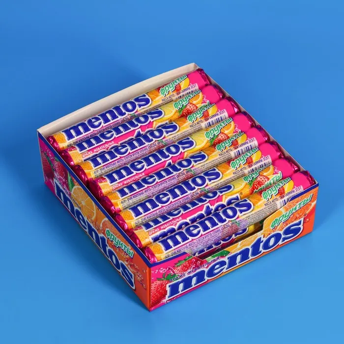 Жевательные драже Mentos Фрукты – это сочетание драже с фруктовыми соками клубники, апельсина и лимона в одном ролле! Дарит уверенность в себе и вдохновляет на свежие идеи. Компактную упаковку удобно брать с собой: ролл легко помещается в кармане, рюкзаке или сумке.