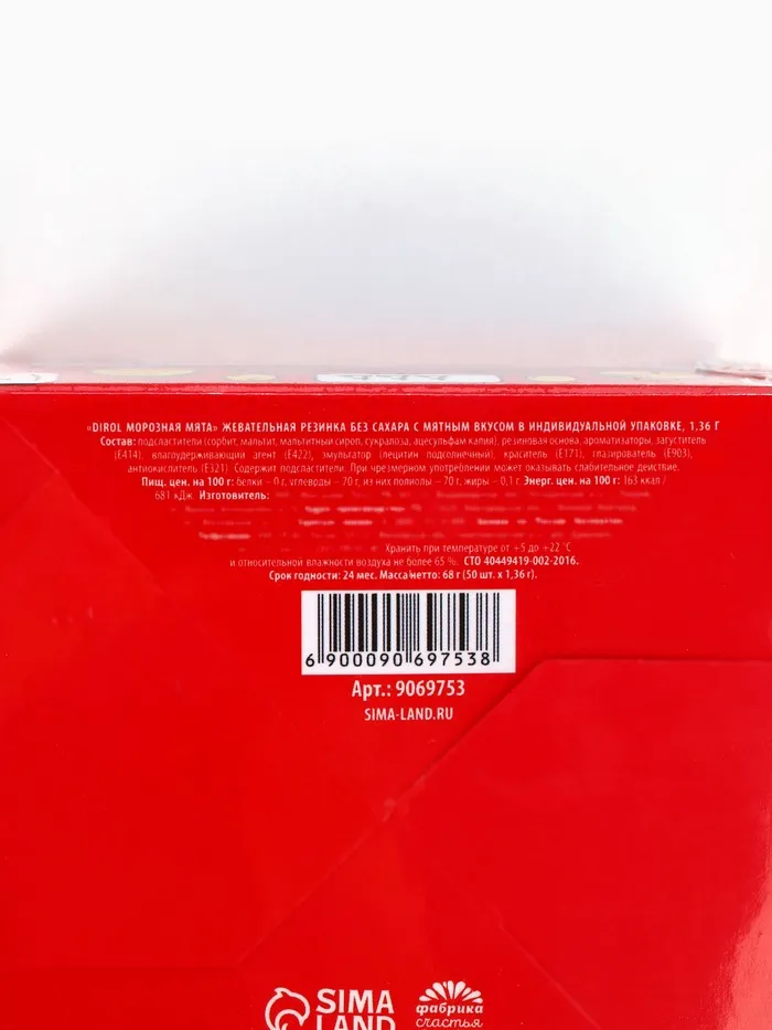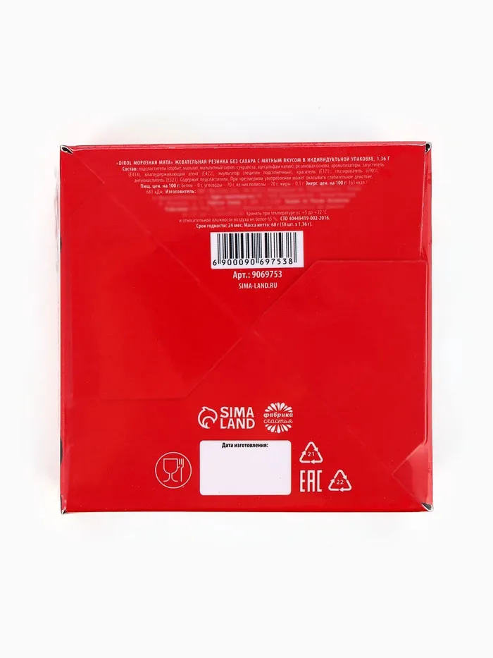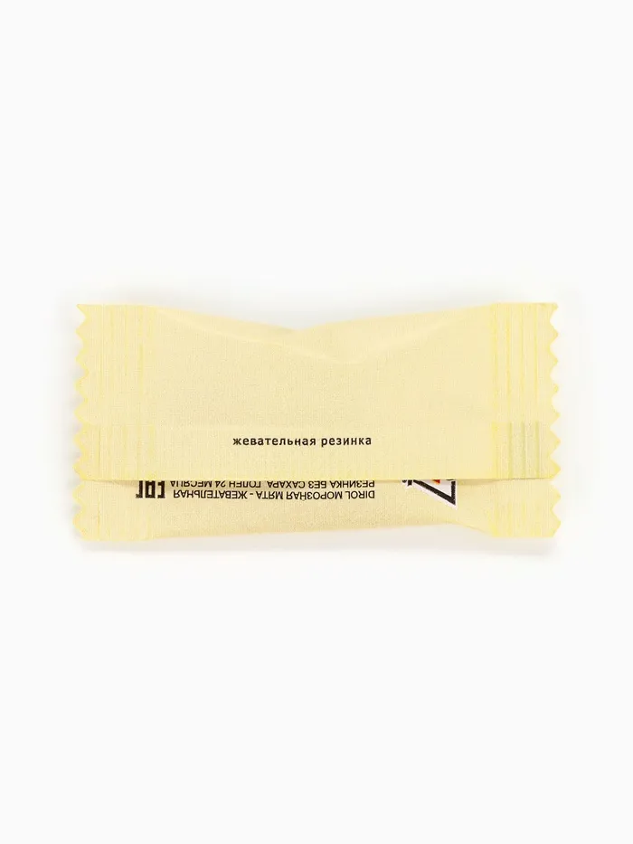 Состав: подсластители (сорбит, мальтит, мальтитный сироп, сукралоза, ацесульфам калия), резиновая основа, ароматизаторы, загуститель (Е414), влагоудерживающий агент (Е422), эмульгаторы (лецитин подсолнечный), краситель (Е171), глазирователь (Е903), антиокислитель (Е321).