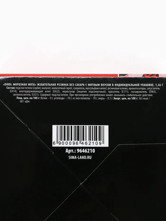 Состав: подсластители( сорбит, мальтит, мальтитный сироп, сукралоза, ацесульфам калия), резиновая основа, ароматизаторы, загуститель (Е141), влагоудерживающий агент (Е422), эмульгатор (лецитин подсолнечный), краситель (Е171), глазирователь (Е903), антиокислитель (Е321).