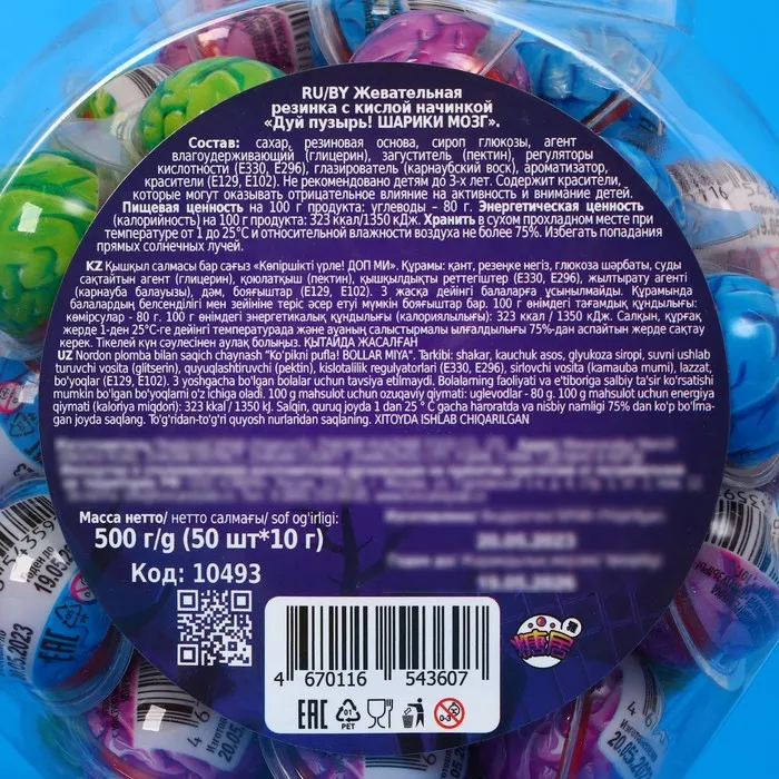 Жевательная резинка с кислой начинкой "Дуй пузырь!" — это яркая жвачка, которое подарит незабываемые эмоции и радость каждому любителю сладостей! Эта жевательная резинка с оригинальным дизайном в виде мозга приведет в восторг как детей, так и взрослых, добавляя в каждый момент немного волшебства и веселья.