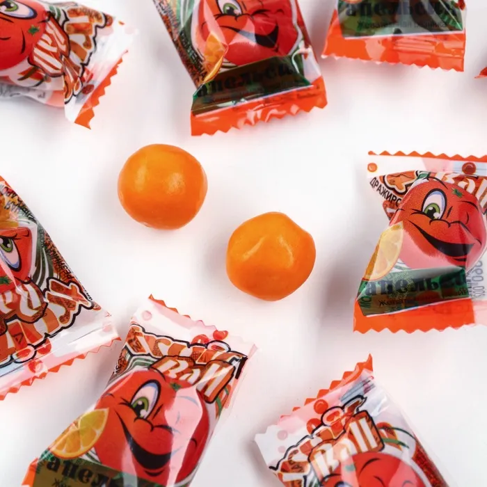 Состав: сахар, патока, полимерная основа, влагоудерживающий агент - глицерин, регулятор кислотности - кислота лимонная, желатин, ароматизатор, идентичный натуральному, апельсин, пищевой краситель Е120, загуститель - желатин, глянцеватель - капол.