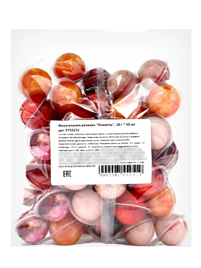 Состав: сахар, глюкозный сироп, резиновая основа, регулятор кислотности (лимонная кислота), эмульгатор (соевый лецитин), антиокислитель (бутигидрокситодуол), ароматизатор (тутти-фрутти), красители Е102, Е129, Е133.