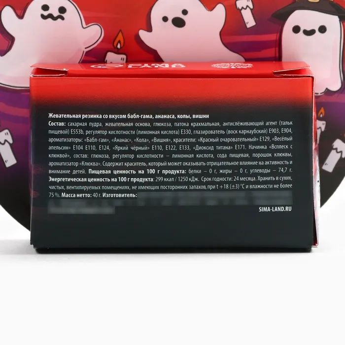 Состав: сахарная пудра, жевательная основа, глюкоза, патока крахмальная, антислёживающий агент (тальк пищевой) Е553b, регулятор кислотности (лимонная кислота) Е330, глазирователь (воск карнаубский) Е903, Е904, ароматизаторы: «Бабл-гам», «Ананас», «Кола», «Вишня», красители: «Красный очаровательный» Е129, «Весёлый апельсин» Е104 Е110, Е124, «Яркий чёрный» Е110, Е122, Е133, «Диоксид титана» Е171. Начинка «Всплеск с клюквой», состав: глюкоза, регулятор кислотности – лимонная кислота, сода пищевая, порошок клюквы, ароматизатор «Клюква».