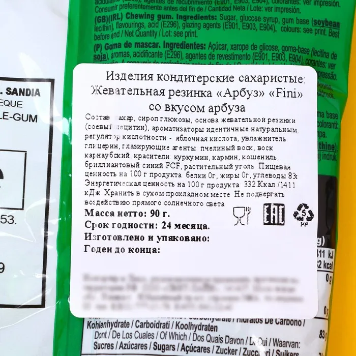 Состав: сахар, сироп глюкозы, основа жевательной резинки (соевый лецитин), ароматизаторы идентичные натуральным, регулятор кислотности - яблочная кислота, увлажнитель: глицерин, глазирующие агенты: пчелиный воск, воск карнаубский, красители: куркумин, кармин, кошениль, бриллиантовый синий FCF, растительный уголь.