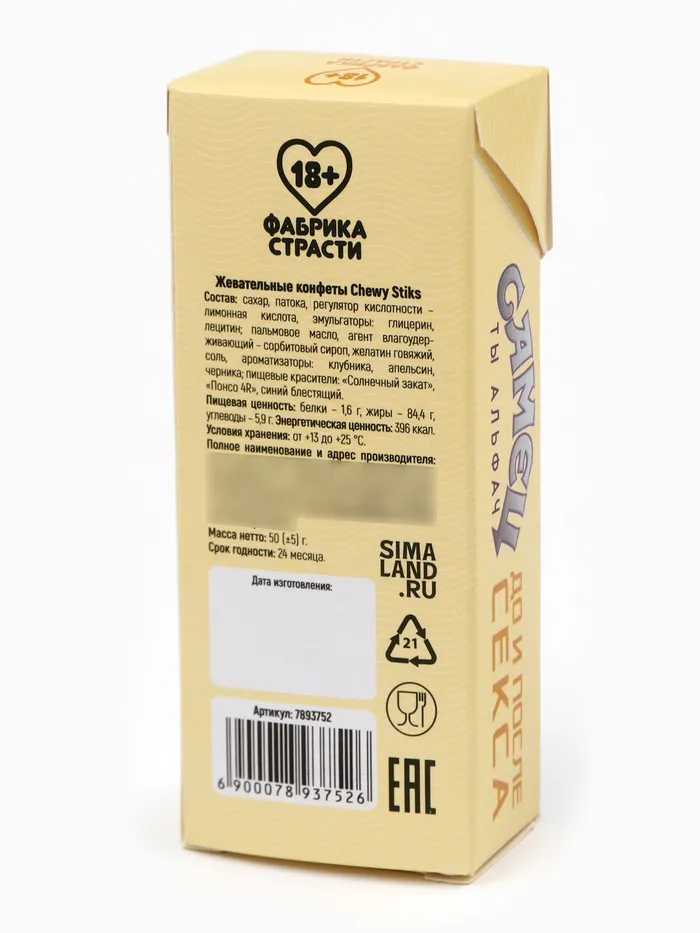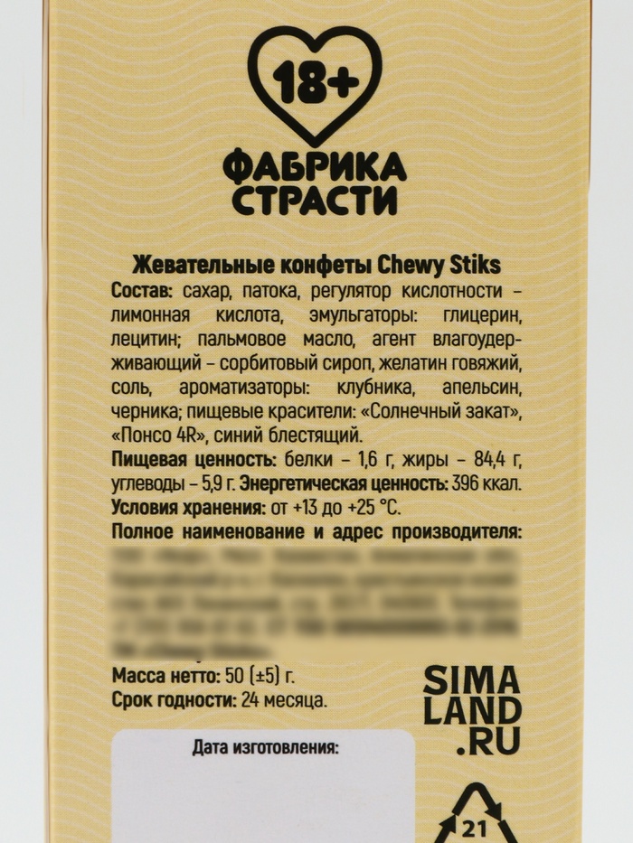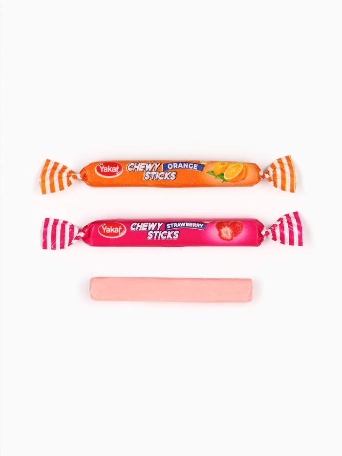 Состав: сахар, сироп глюкозный, масло растительное (пальмовое), регулятор кислотности (лимонная кислота), желатин говяжий, концентрат сока клубники (0,3 %), концентрат сока вишни (0,4 %), концентрат соков апельсина и лимона (0,2 %), эмульгаторы (Е471, лецитин подсолнечный), ароматизатор искусственный, идентичный натуральному, краситель (красный свекольный, Е160а).